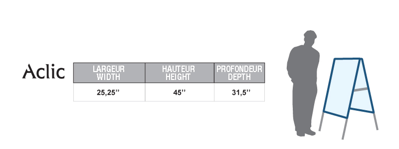 Le « Aclic » est un porte-affiche recto-verso en aluminium, au fini anodisé argent. Il peut-être utilisé à l’intérieur ou à l’extérieur et se referme à plat pour un rangement facile. Grâce à son système à clips, le changement de visuel se fait en un tour de main.