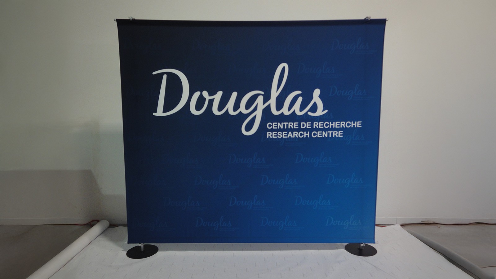 Les barres télescopiques s’assemblent facilement pour ensuite y insérer le visuel, sans aucun outil nécessaire.