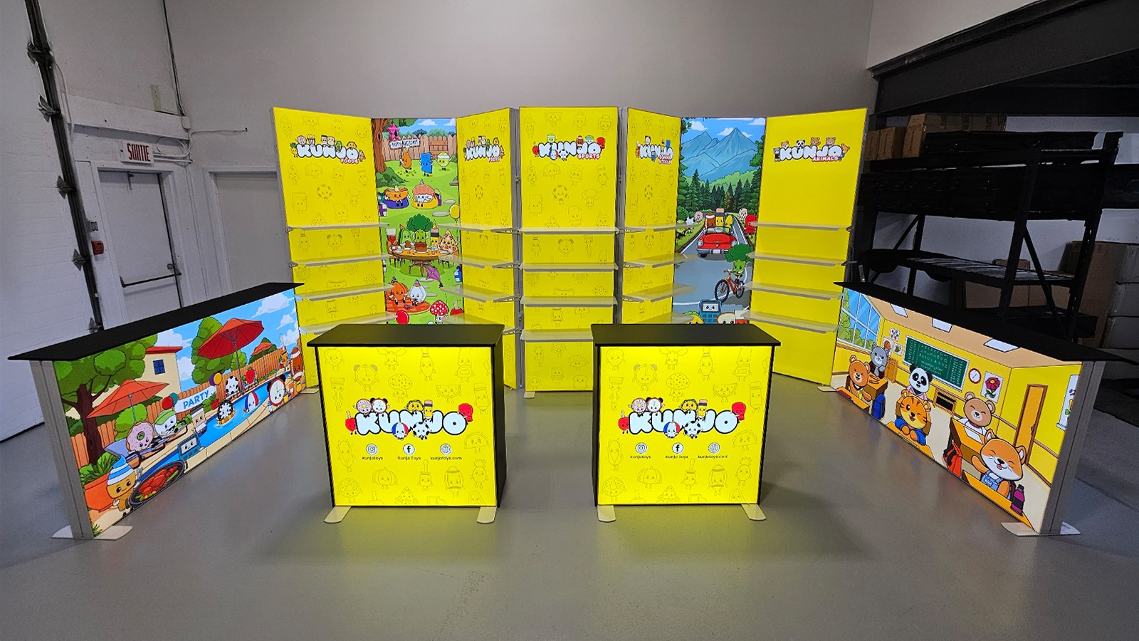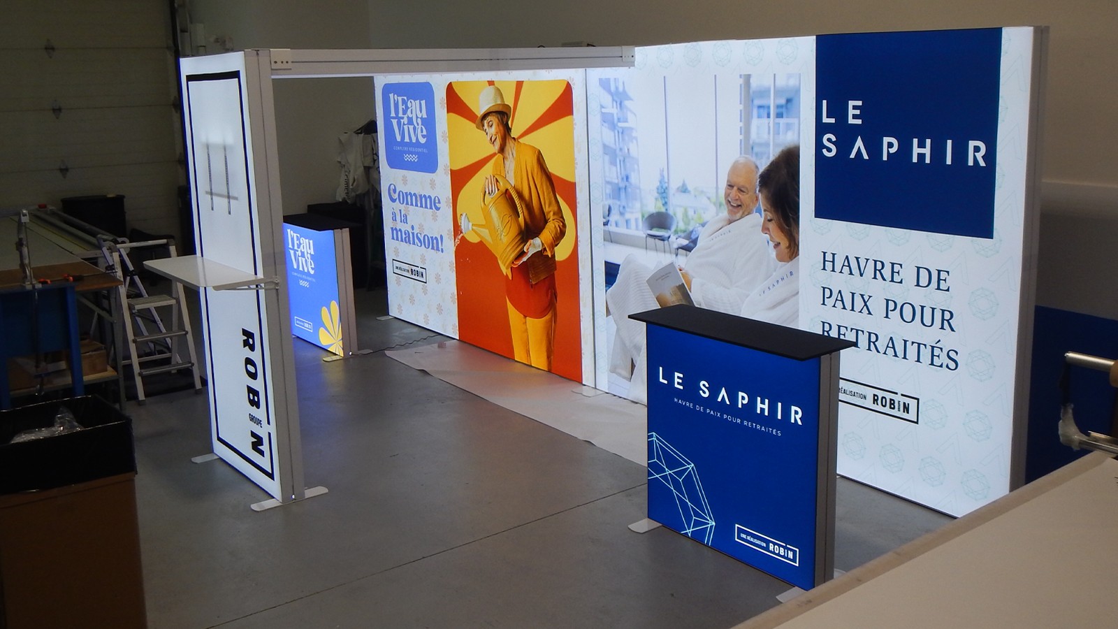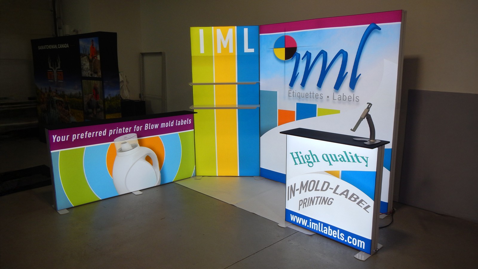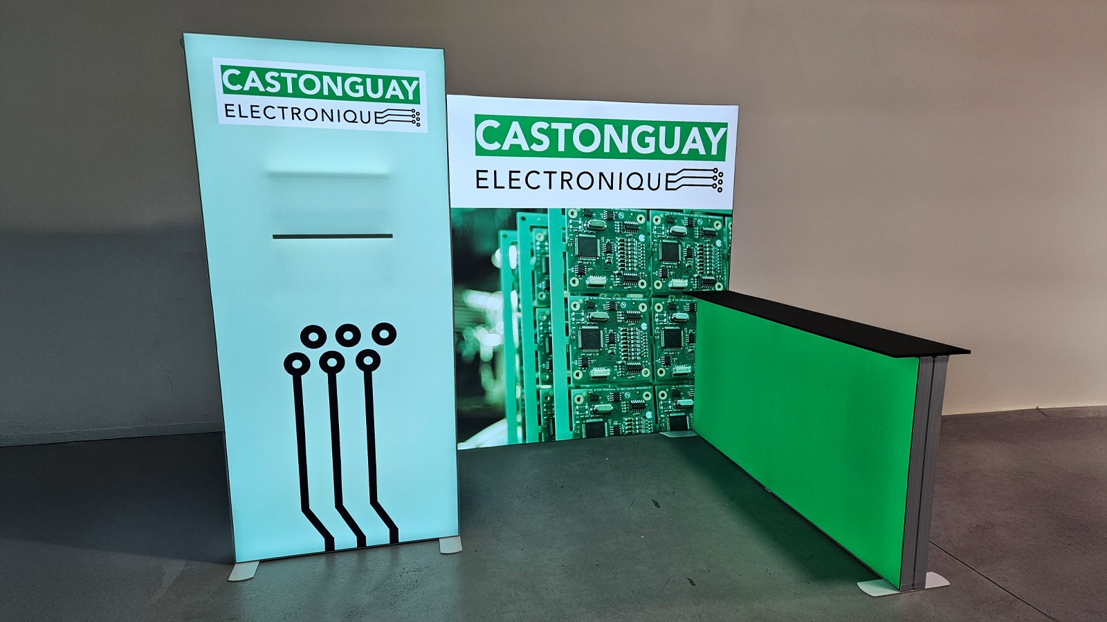 Ajoutez-y un comptoir d’accueil, lui aussi lumineux, et voilà un stand d’exposition complet qui a du punch.