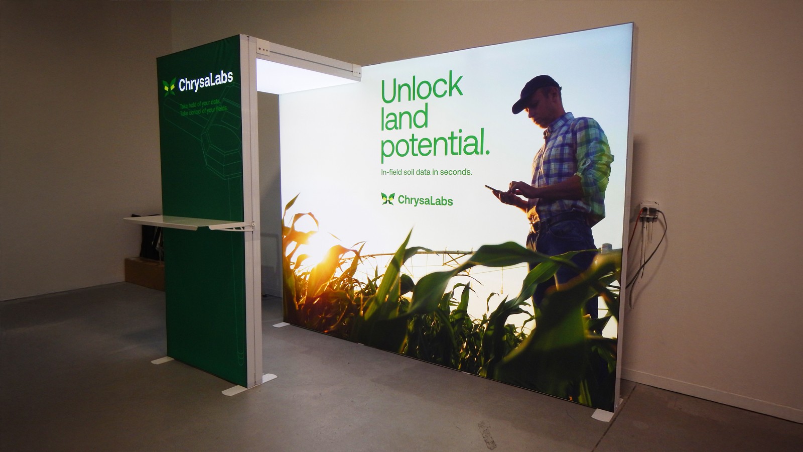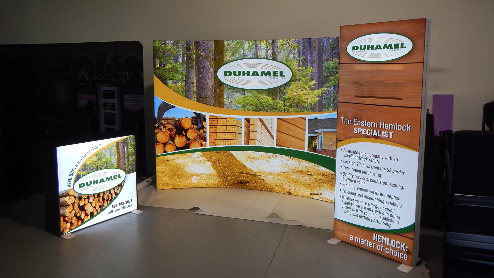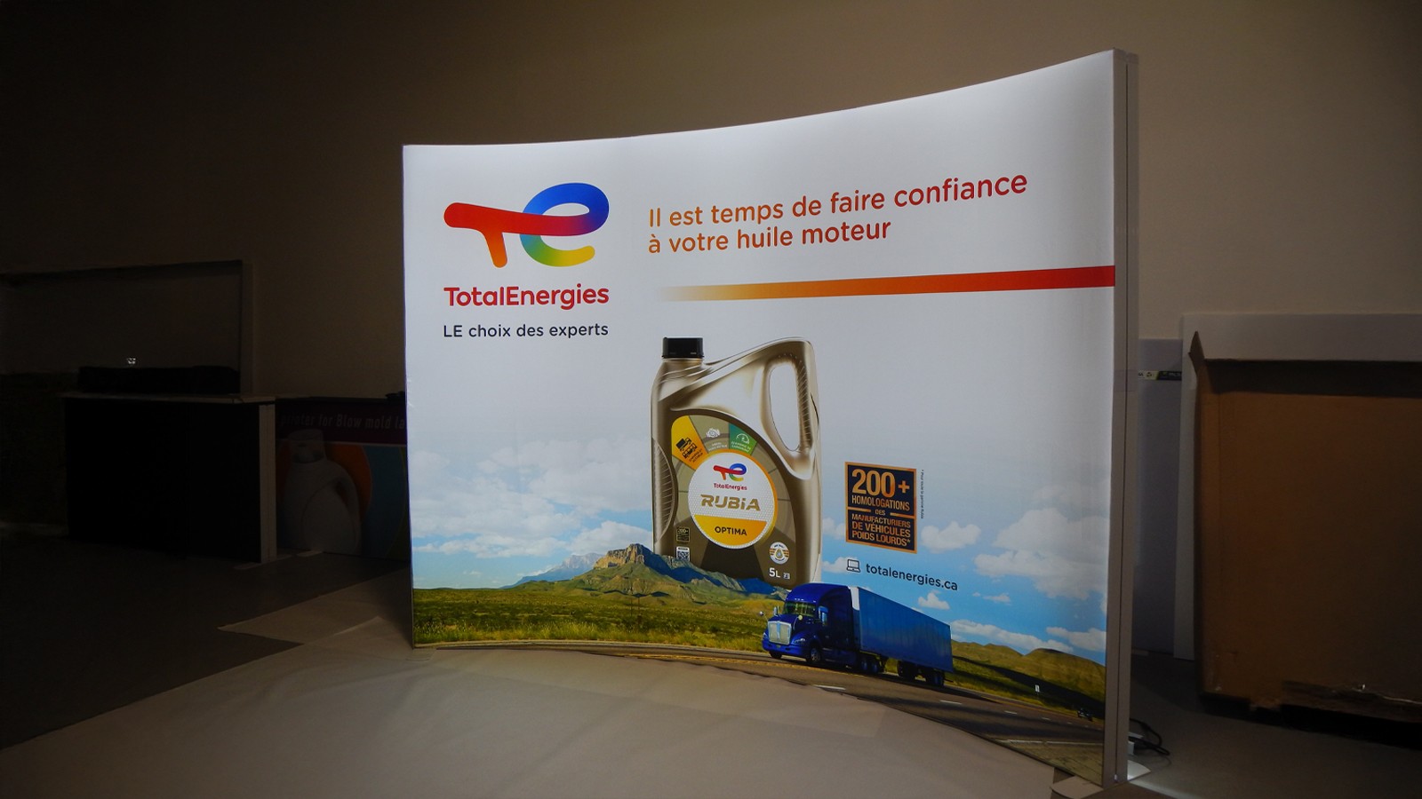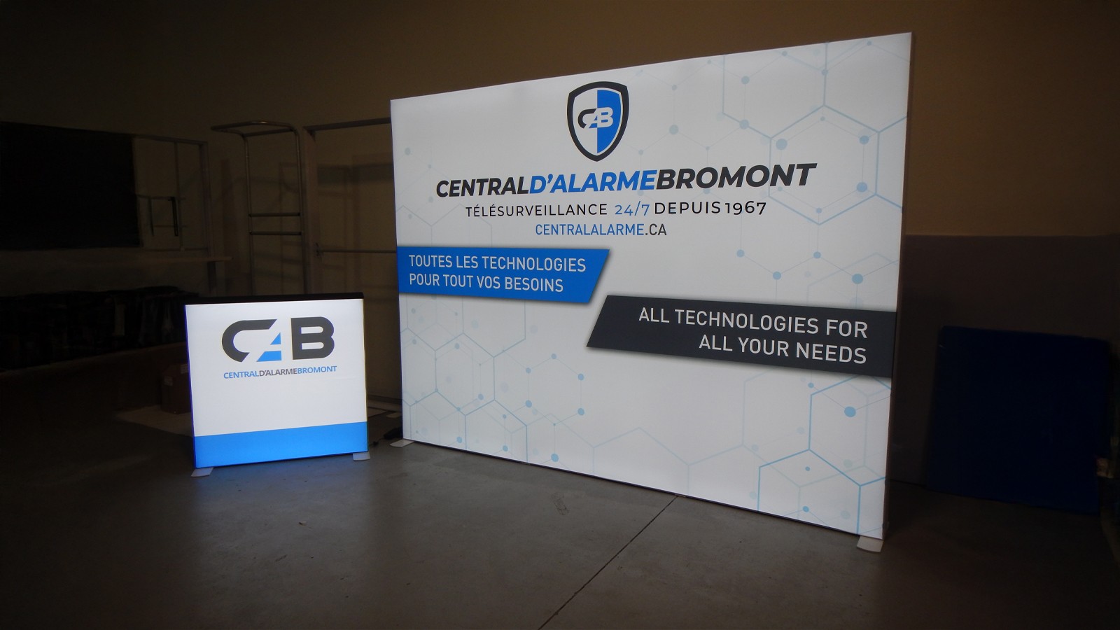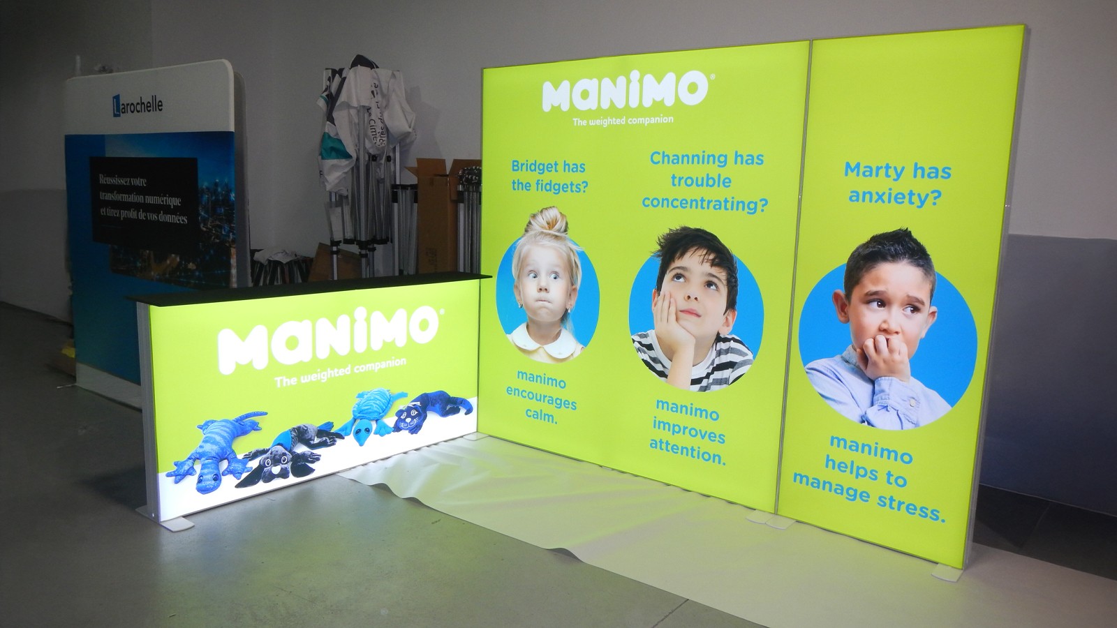 Ajoutez-y un comptoir d’accueil, lui aussi lumineux, et voilà un stand d’exposition complet qui a du punch.